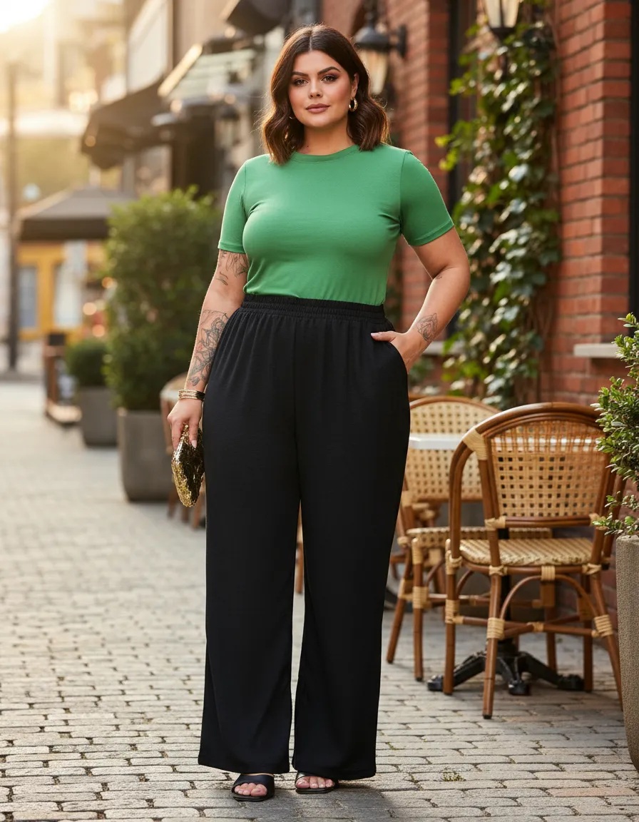 Calça Pantalona Plus Size Wide Leg Cós Alto Elegante Premium