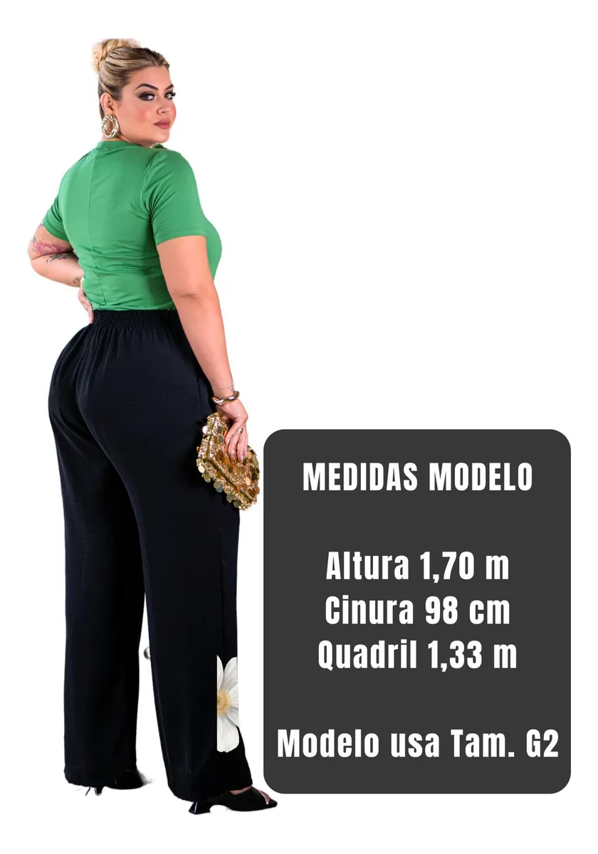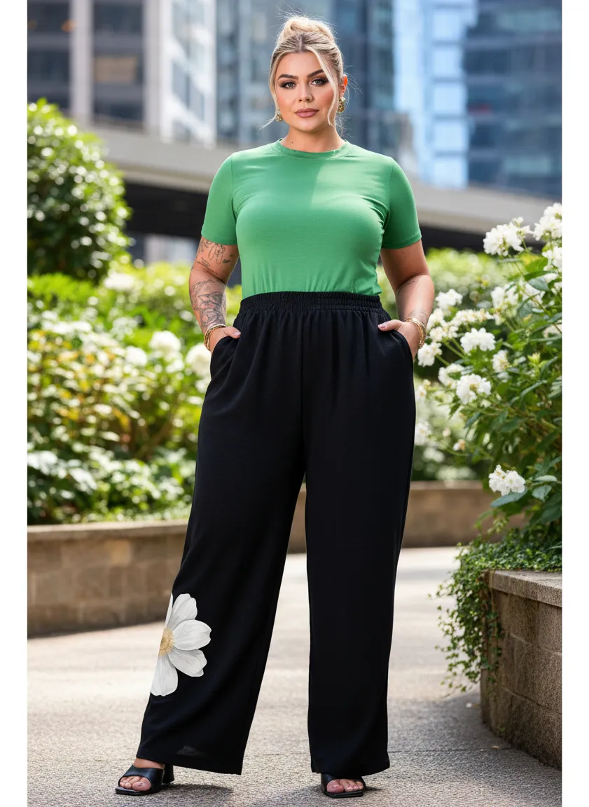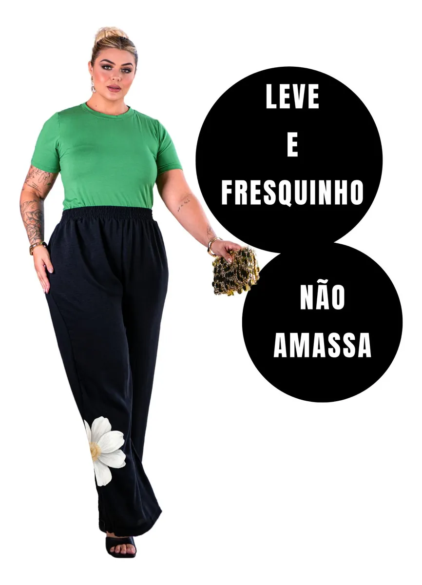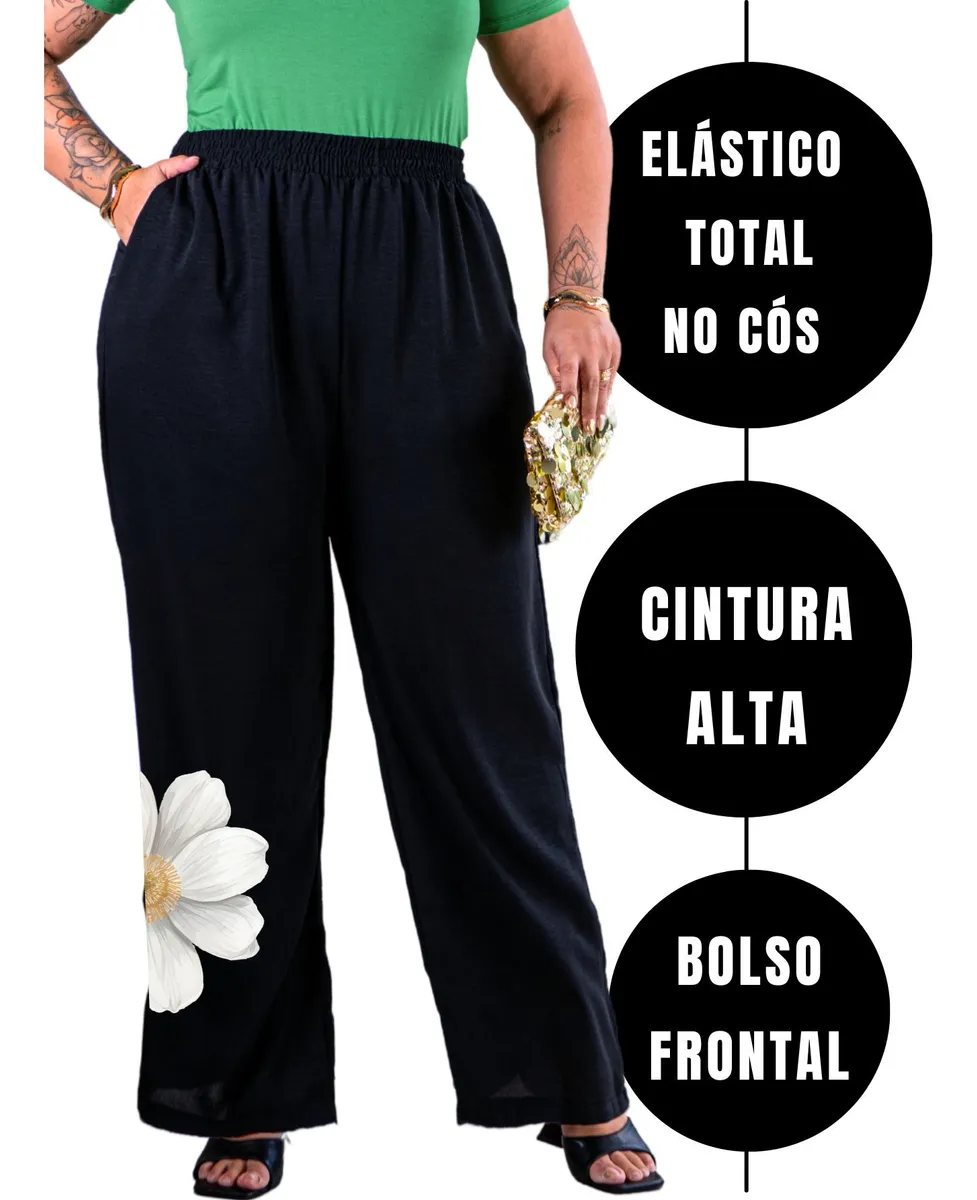 Calça Pantalona Plus Size Wide Leg Cós Alto Elegante Premium, elástico total, 2 bolsos frontais, estampa frontal Floral, tendência.
