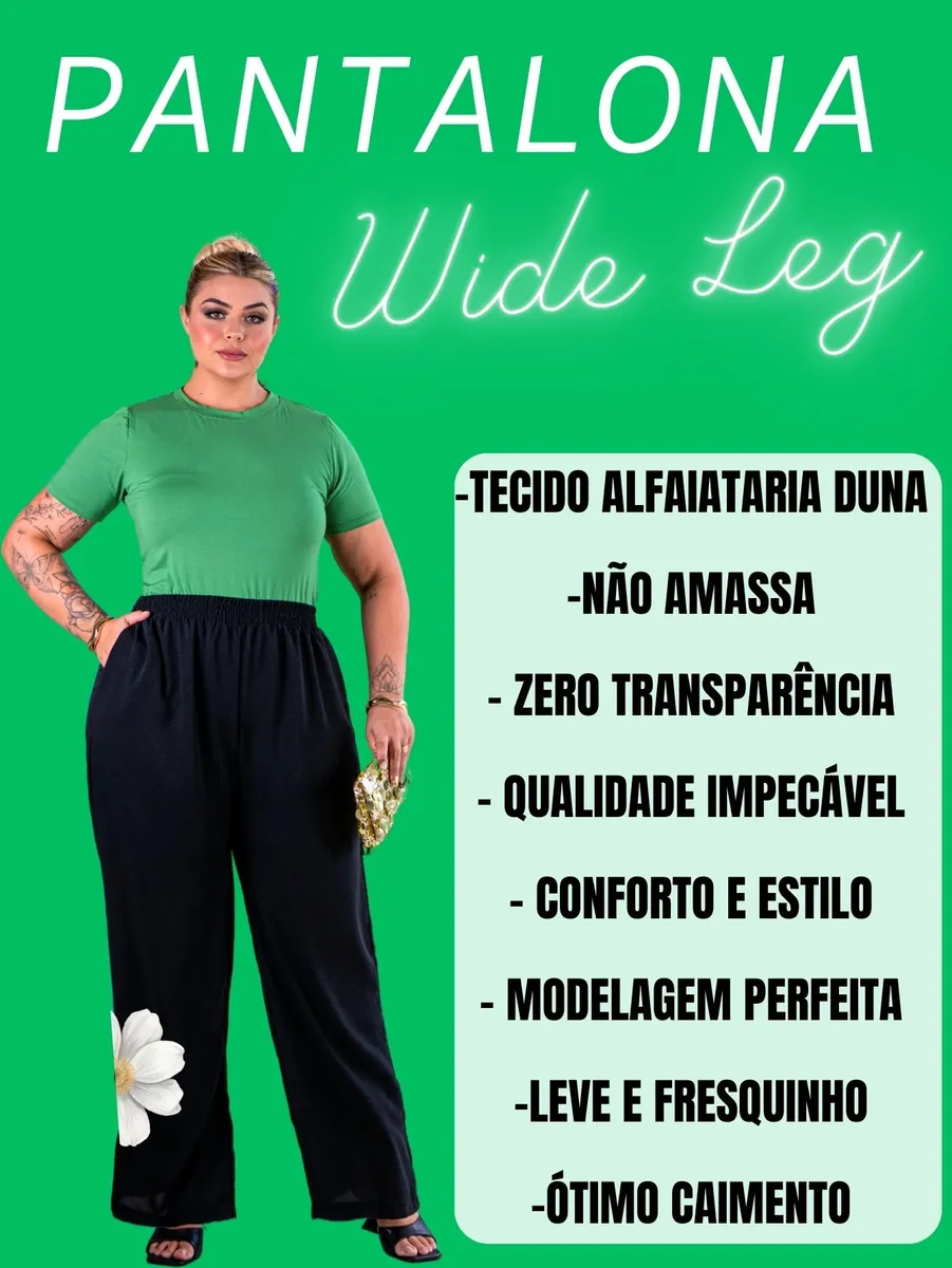 Calça Pantalona Plus Size Wide Leg Cós Alto Elegante Premium