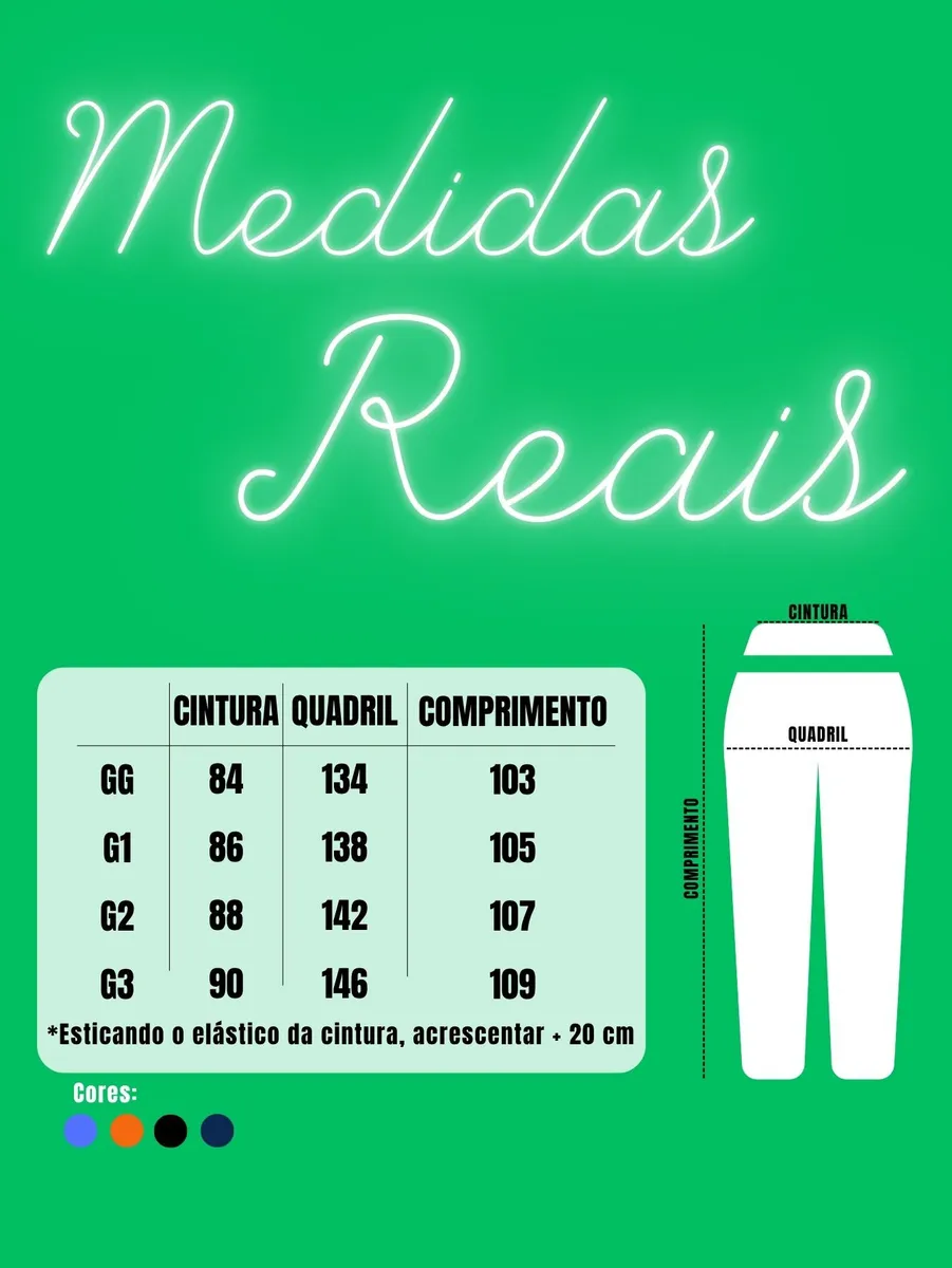 Cintura: 88 cm (esticando o elástico, aumentar + 20 cm)