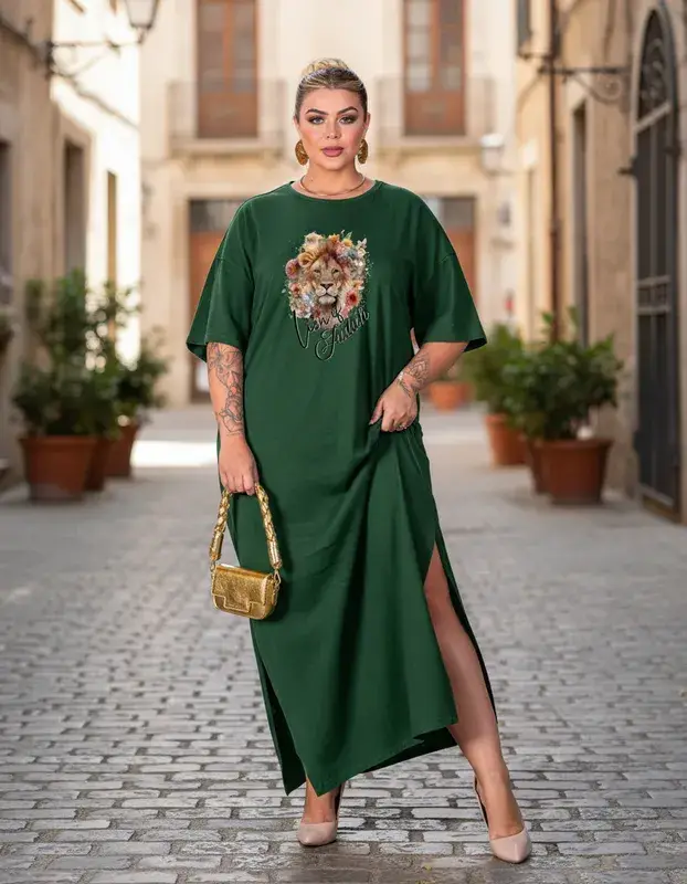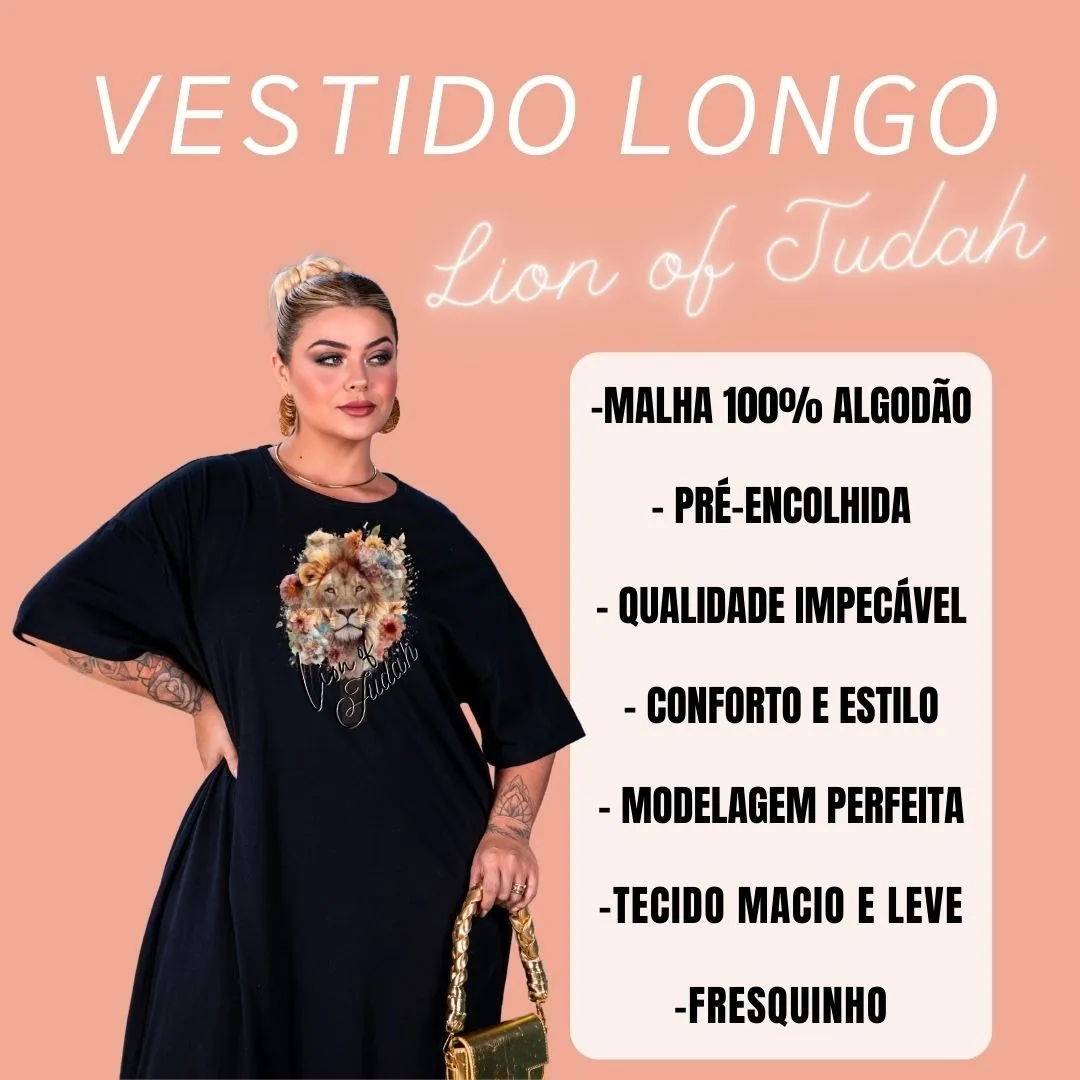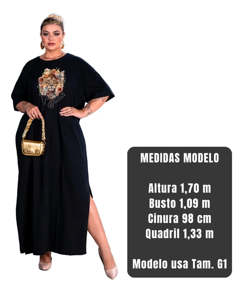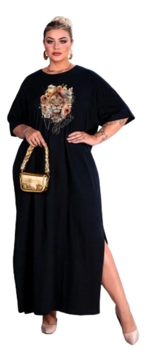Vestido Longo Plus Size Elegante, estampa exclusiva Lion Of Judah , manga curta, com abertura nas laterais, comprimento longo, soltinho, modelagem ampla.