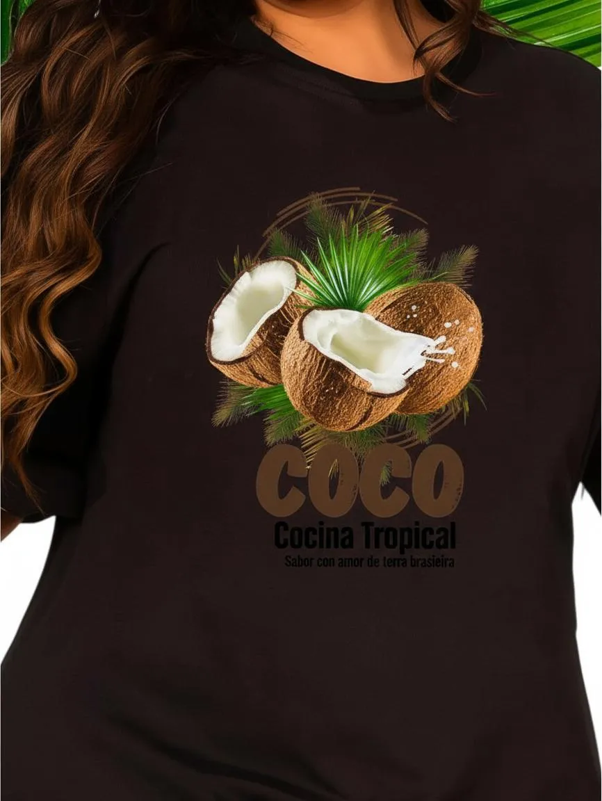 O toque especial? Uma estampa colorida de coco na parte do peito que é puro charme tropical! É aquele detalhe que transforma o look e traz o clima do verão direto pro seu guarda-roupa.